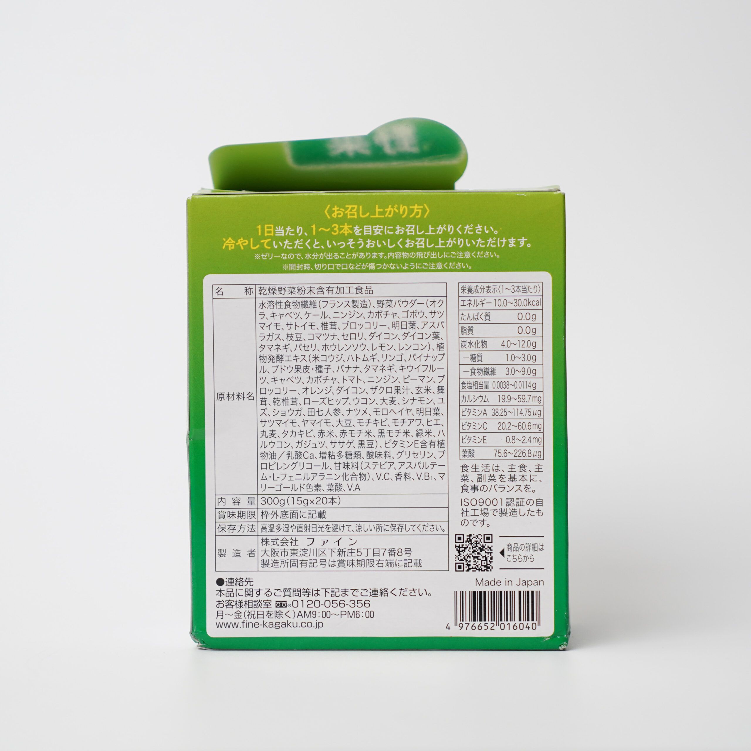 - Chất xơ hòa tan trong nước (sản xuất tại Pháp), bột rau (đậu bắp, bắp cải, cải xoăn, cà rốt, bí ngô, ngưu bàng, khoai lang, khoai lang, nấm đông cô, bông cải xanh, lá mai, măng tây, đậu lông, cải bó xôi, cần tây, củ cải, lá củ cải, hành tây, mùi tây, rau bina, chanh, ngó sen), chiết xuất thực vật lên men (gạo koji, mật ong, táo, dứa, vỏ và hạt nho, chuối, hành tây, trái kiwi, bắp cải, bí ngô, cà chua, cà rốt, hạt tiêu, bông cải xanh, trái cam, củ cải, nước ép lựu, gạo lứt, nấm maitake, nấm đông cô khô, bông hồng, ngô, lúa mạch, quế, yuzu, gừng, bảy củ cà rốt, quả hạch, rau đay, lá Angelica keiskei, khoai lang, khoai mỡ, đậu tương, mochikibi mochiawa, Echinochloa esculenta, lúa mạch tròn, Takakibi, gạo đỏ, gạo mochi đỏ, gạo mochi đen, cốm, cá mòi, nghệ đen, cây xô thơm, đậu đen), dầu thực vật chứa vitamin E / Canxi lactate, polysaccharides làm đặc, chất axit hóa, glycerin, propylene glycol, chất làm ngọt (stevia), hợp chất Aspartame L-phenylalanine), V.C, hương liệu, V.B1, sắc tố cúc vạn thọ, axit folic, V.A