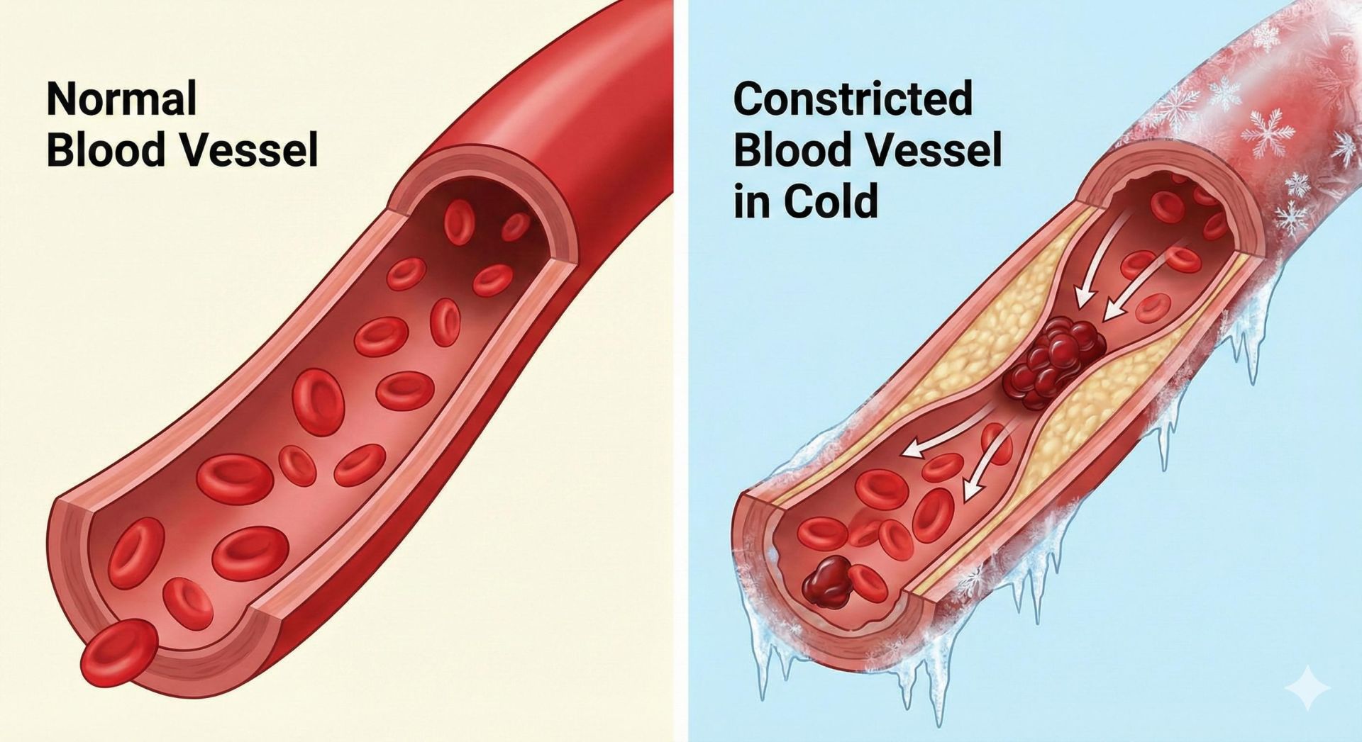 So sánh mạch máu bình thường và mạch máu bị co thắt, hình thành cục máu đông khi trời lạnh.