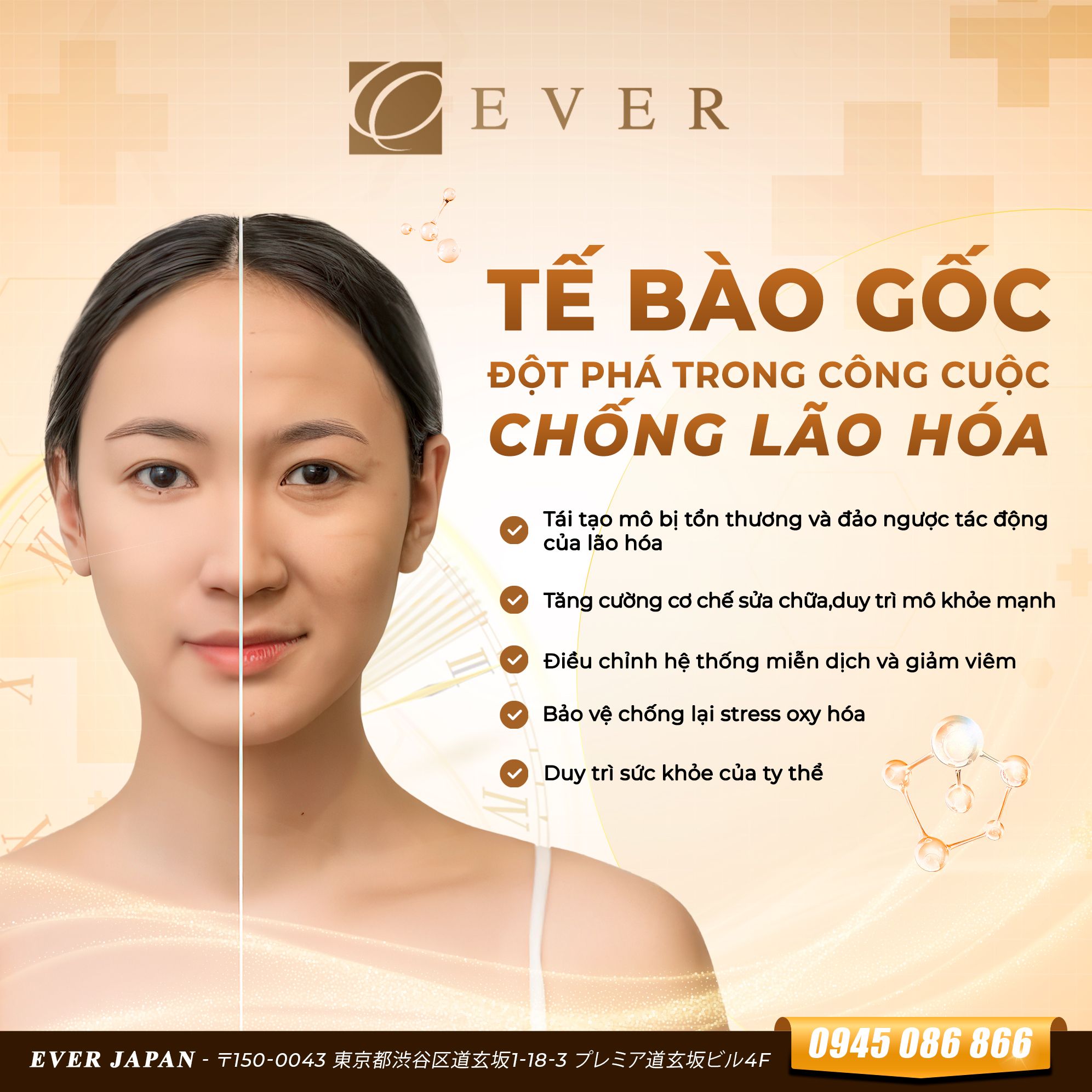 Tập Đoàn Y Tế Tái Sinh Và Thẩm Mỹ Công Nghệ Cao EVER là tập đoàn tiên phong, hàng đầu tại Nhật trong lĩnh vực y học tái sinh, ứng dụng tế bào gốc và thẩm mỹ công nghệ cao. Hiện nay, EVER đứng số 1 tại Nhật Bản về chất lượng dịch vụ và về số lượng khách hàng người Nhật cũng như người nước ngoài tới sử dụng các dịch vụ (Trên 80.000 khách hàng sử dụng liệu pháp tế bào gốc và các liệu pháp thẩm mỹ công nghệ cao như thẩm mỹ chỉ vàng, tiêm FGF, NMN,…)...Xem thêm